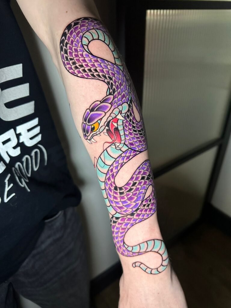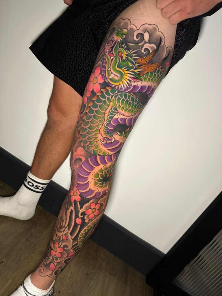 Maddie’s been part of NMT for over four years. She specialises in Neo Traditional and Japanese style tattoos, with a love for dragons, bold lines, and bright colours; which earnt her the nickname ‘Dragon Queen’.